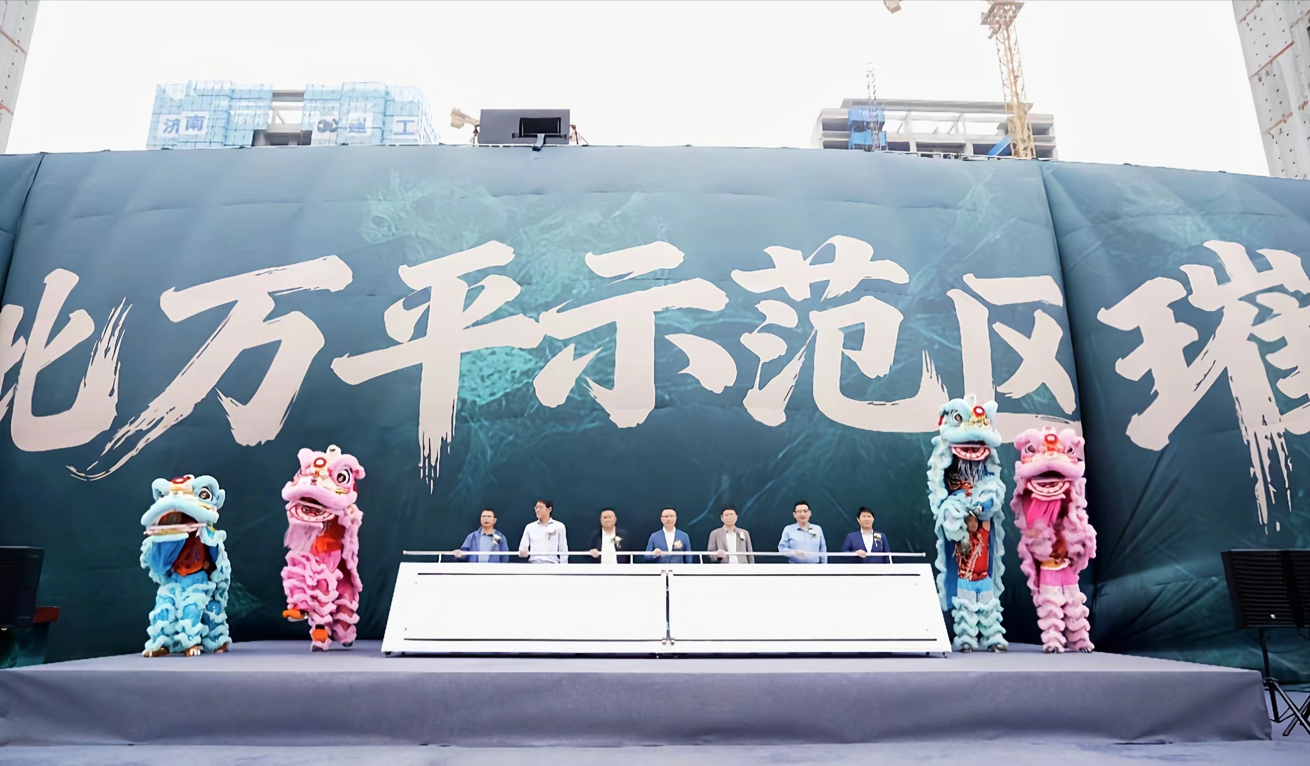 十點十分,祥瑞舞獅躍動登場,昂揚騰挪間,為項目注入吉祥寓意與勃勃生機,將現(xiàn)場氛圍推向高潮。接著,在全場嘉賓的矚目與倒數(shù)聲中,張總攜手多位領(lǐng)導(dǎo)共同推動啟動桿,舞臺吸幕瞬間升起,金海瑞園恢弘的大門豁然眼前,萬平園林示范區(qū)的勝景也在此刻全景呈現(xiàn),引來陣陣贊嘆。同時,舞獅吐青,卷軸鋪展,“責(zé)任國企,品質(zhì)筑家;瑞境天成,盛啟非凡”十六字宣言熠熠生輝,標志著金海瑞園萬平園林示范區(qū)正式華彩綻放。最后,各位領(lǐng)導(dǎo)在舞臺上合影留念,定格這一意義非凡的瞬間。